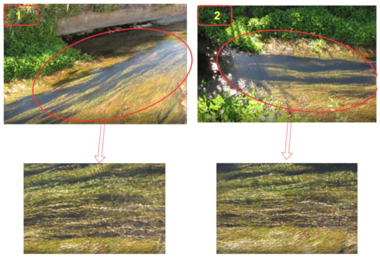 The results reported here account for both approaches, that is, particle tracking to characterize the hydrodynamic regime and extract the velocity profiles, as well as the related metrics for targeting the region of interest. Figure 10 shows two examples of frames taken from the recorded video sequences. The regions of interest are surrounded with red ellipses. All of the videos were recorded under the same conditions, namely, frame rate, shutter speed, white balance, and aperture. By zooming in on the region of interest, one can observe a considerable grass mass moving below the water surface and hindering the free water flow.