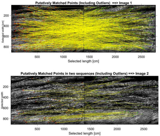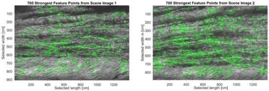 As shown in Figure 11, the algorithm is able to detect the regions of interest (ROI) in both images. The ROI is used to track the particle movement and to reconstruct a field of velocity. A major concentration of ROIs makes it easier to retrieve the velocity. Figure 12 and Figure 13 show the process of assigning tracks in the current frame to existing tracks by minimizing cost. In practice, the cost is defined here as the negative log-likelihood of the detection corresponding to a track. We started by computing the cost of assigning every detection to each track using the distance between the predicted centroid of the track and the centroid of the detection. The results were stored in a matrix, where M is the number of tracks and N is the number of detections. It is important to note here that, when the motion of an object (whether it is grass of a different particle in the water) significantly deviates from this model, it may produce tracking errors. These errors can be reduced by using more complex models, such as constant acceleration or multiple Kalman filters for each tracking object.