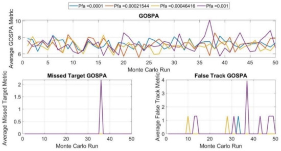 Figure 14 shows the performance of the tracker in a scenario based on running 50 Monte Carlo realizations for each possible false alarm rate. Any rise in false alarm rate, for example when Pfa = 0.0001, Pfa = 0.0002, and Pfa = 0.001, corresponds to an increased probability of generating false tracks. This probability is much higher in proximity to the camera, where the density of the resolution cells is much higher. Therefore, as false alarms are closely spaced and appear frequently in this region, they can be misclassified as low-velocity false-tracks. This tracker behavior can be observed in the average false tracker component of the GOSPA metric per scenario run. It is worth mentioning here that, as the false alarm rate increases, the number of peaks in the plot increases as well. This also leads to an increase in the total GOSPA metric. The missed target component is zero for most runs.