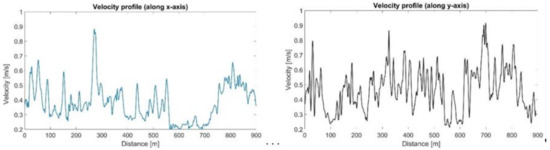 The recovered velocity profiles can be broken down into two components, the cross and longitudinal velocity profiles, as shown in Figure 15. The maximum values of both components are around 0.9 m/s, compatible with the flow rate reported in the previous section.