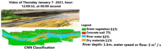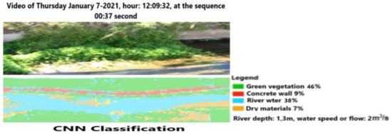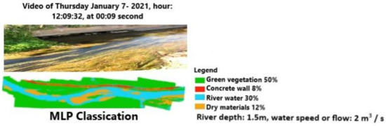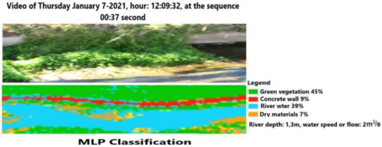 The machine learning approach, using the powerful tool connected to the classification of all video frames, delivers more details than the previous one. Figure 16 and Figure 17 show, for the same time range of Figure 10, how the CNN and MLP classifications can recognize the main elements of the scene, such as the green vegetation, the concrete wall along the channel, the surface of water, dry materials, and river depth. The values in the legend can be verified by processing a corresponding satellite image. In particular, the channel depth (1.3 m) and the flow (2 m3/s) are close to the measured values, as reported in Section 2. The difference in the amount of vegetation or water surface classified by CNN and MLP is .