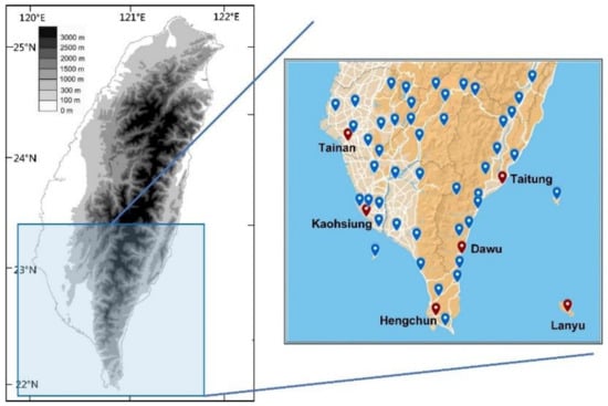 The left part of Figure 1 indicates that the Central Mountain Range (CMR) runs south–north and divides Taiwan into the eastern and western regions. The total length of the CMR is approximately 340 km, and its width from east to west is approximately 80 km. The average altitude of the range is approximately 2500 m [39]. The Tainan and Kaohsiung stations are located to the west of the CMR, the Hengchun station is located to the south of the CMR, the Taitung and Dawu stations are located to the east of the CMR, and the Lanyu station is located in an outlying island (bottom right of Figure 1).