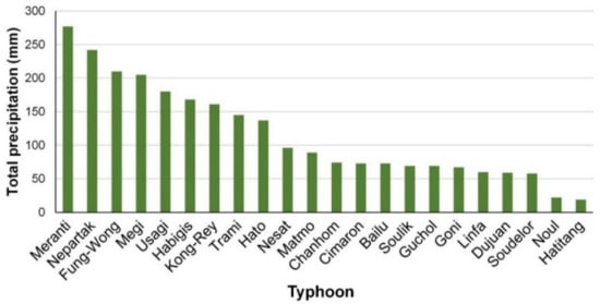 Figure 2 displays the accumulated precipitation of each typhoon in descending order. The top nine typhoons in terms of precipitation, namely Typhoons Trami, Kong-Rey, Usagi, Habigis, Fung-Wong, Nepartak, Meranti, Megi, and Hato, had relatively high precipitation (accumulated precipitation > 100 mm), whereas the others had relatively low precipitation.