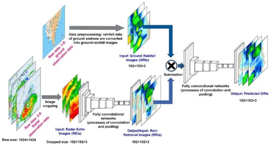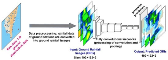 - To address the input–output patterns in the FCN modeling process using 2-D array data, this study converted the rainfall data of ground stations into 2-D images.