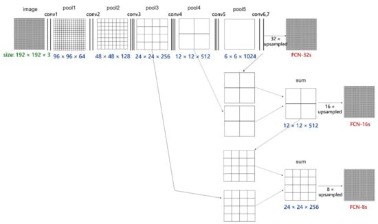 Architecture of GRI_FCN-based FCN-32s, FCN-16s, and FCN-8s and the size information of input images and feature maps in each conv-pool stage. (these FCN-type architectures contain the processes of conv1–conv7 and pool1–pool5; the architecture was referred to [37] and modified for modeling the model cases in the work).