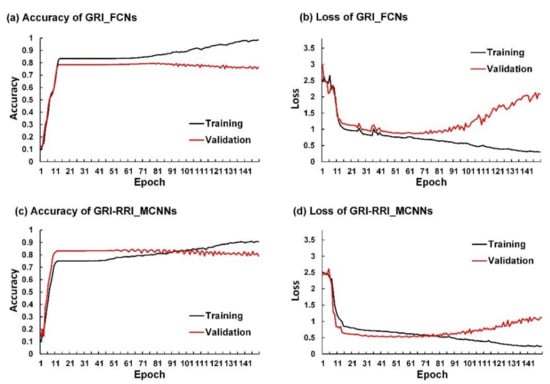 When running the GRI_FCN and GRI-RRI_MCNN models, the parameter settings of the convolutional and pooling layers were as follows: kernel size = (2, 2), padding method = same, maxpooling with filter size = (2, 2), strides = (2, 2), and the activation function = rectified linear unit function. Moreover, the settings of output layers were as follows: kernel size = (8, 8), strides = (8, 8), and the activation function = softmax function. The loss function was categorical cross entropy. The number of intermediate layers in the FCNs can be seen in the following section.