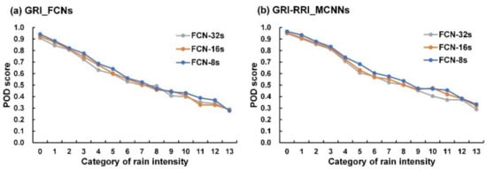According to [47], the probability of detection (POD) is equal to the number of hits divided by the total number of rain observations; thus it gives a measure of the proportion of rain events successfully forecast. Here, the POD measure was employed to the evaluate the accuracy of per-rain-intensity-category. Figure 9 plots the diagram for POD scores for GRI_FCNs and GRI-RRI_MCNNs as FCN-based architectures were applied. In the figure, the POD scores decreased when the rain-intensity category number increased using GRI_FCNs and GRI-RRI_MCNNs. This trend implies that these cases might correctly predict light rain but misclassify for heavier rain.