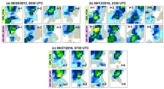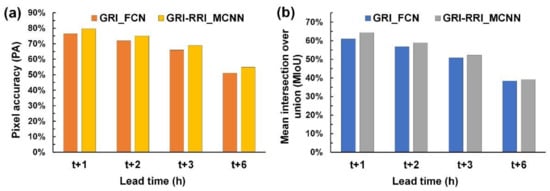 Rainfall prediction was performed for three typhoons (i.e., Kong-Rey, Meranti, and Megi) to evaluate the effectiveness of the designed GRI_FCN and GRI-RRI_MCNN models. Figure 10 displays the predicted GRI images when using the testing set. To examine the accuracy of model performance, this study also calculated the PA and MIoU metrics. Figure 11 reveals that the GRI-RRI_MCNN model outperformed the GRI_FCN model for all lead times.