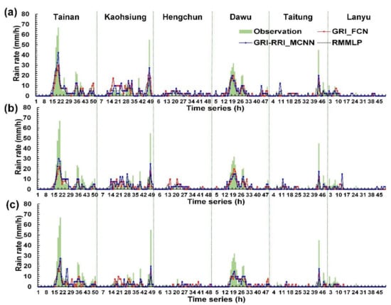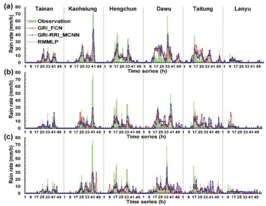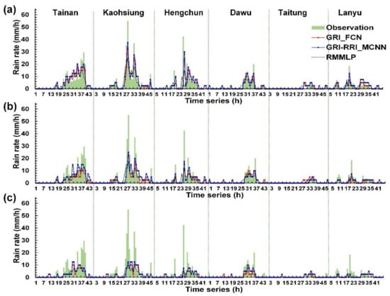 Wei and Hsieh [44] presented a radar mosaic-based multilayer perceptron (RMMLP) model, which is a conventional type of artificial neural networks that includes input, hidden, and output layers. The additional fully connected layer directly receives the cropped radar mosaic images to be flattened to a 1-D array. Here, the RMMLP model was used to a benchmark model and compared with those results made by GRI_FCN and GRI-RRI_MCNN in the six weather stations. Figure 12, Figure 13 and Figure 14 depict the rainfall prediction results of the six weather stations during Typhoons Kong-Rey, Meranti, and Megi.