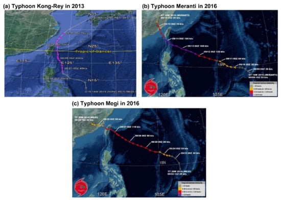 Paths of (a) Typhoon Kong-Rey, (b) Typhoon Meranti, and (c) Typhoon Megi (the maps were obtained from the website of the Joint Typhoon Warning Center [48].