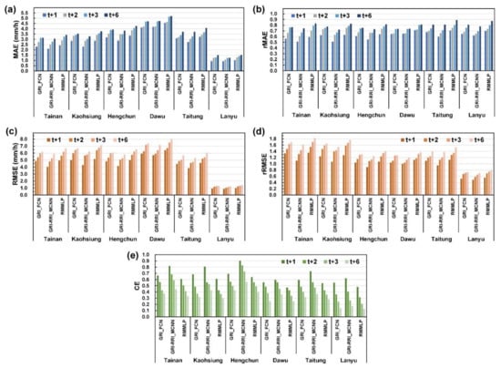Figure 16 depicts the MAE, rMAE, RMSE, rRMSE, and CE of the results obtained at the six CWB stations. First, the absolute errors (i.e., the MAE and RMSE) were used to evaluate the obtained results (Figure 16a,c). The evaluation indicated that the absolute errors of GRI-RRI_MCNN were smaller than those of GRI_FCN and RMMLP. The values of the aforementioned parameters for the six stations in GRI-RRI_MCNN were compared. The results revealed that the Lanyu station had the lowest absolute errors among the six stations because this station was located at the sea and experienced limited rainfall and terrain effects. Among the remaining land stations, the largest absolute errors were observed at the Dawu station, followed by the Hengchun, Taitung, Kaohsiung, and Tainan stations.