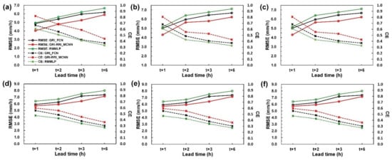 We calculated the average IMPCE measures of six stations for 1–6 h predictions using GRI-RRI_MCNN and GRI_FCN. After calculation, the average IMPCE of GRI-RRI_MCNN and GRI_FCN were respective values of 18.9% and 6.5% for 1 h predictions, 14.9% and 5.5% for 2 h, 13.6% and 4.7% for 3 h, and 9.7% and 3.7% for 6 h. Therefore, we determined that the improvement metric resulting from GRI-RRI_MCNN was higher than that from GRI_FCN.