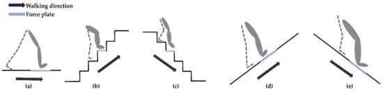 The force plate (9260AA6; Kistler, Winterthur, Switzerland) recorded data at a sampling rate of 1200 Hz, and their data collection was synchronized with that of the wireless EMG system to identify the stance phase in each participant’s walk. The force plate and EMG data for each walking environment were recorded simultaneously; in particular, the vertical ground reaction force (vGRF) was used to find the stance phase in each trial. The force plate was embedded in different positions as appropriate for each walking environment (Figure 1).
