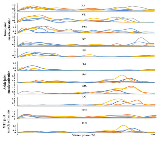 A wireless EMG system (Wave plus wireless, Cometa, Milan, Italy) was used to record muscle activation data from the participants’ rectus femoris (RF), vastus medialis and lateralis (VM and VL), semitendinosus (ST), biceps femoris (BF), tibialis anterior (TA), soleus (Sol), medial and lateral gastrocnemius (MG and LG), flexor hallucis longus (FHL), and extensor digitorum longus (EDL) at a sampling rate of 1200 Hz while walking. The sEMG sensors were attached to the muscle bellies, while an inter-electrode distance of 20 mm at the recommended locations was maintained (Figure 2).