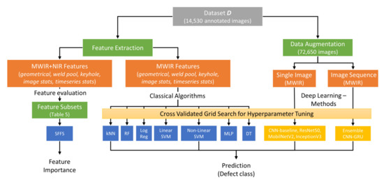 Due to high process dynamics and partially chaotic keyhole behaviors [12], an approach based on precise physical modelling of the welding process is not practical for real-time quality diagnosis of laser welds [13]. On the other hand, the incorporation of new technologies such as Industrial Internet of Things (IIoT) and advanced analytics into manufacturing systems aims to produce individualized products at high quality and low costs. In the manufacturing domain, such data-driven approaches have been extensively studied in the past and are based on autoregressive (AR) models, cluster analysis, fuzzy set theory or on supervised learning algorithms such as multivariate regression, multi-layer perceptron and decision trees, as well as k-nearest neighbors [14,15]. Therefore, recent development led to advanced process monitoring systems which integrate machine learning techniques for process control and prediction of critical defects [16,17]. An advantage of data-driven methods is that it is not necessary to explicitly model the physical behavior of the system in order to build a statistical model. However, process understanding can help to design and develop the right feature set and to select relevant sensors and signal sources as input for the data-driven model. A data-driven model utilizes input variables (features) extracted from the raw signals to establish a statistical model between those features and the observed phenomena, e.g., weld defects during the welding process. Therefore, features that describe the significant characteristics of the signal are required for classical supervised learning algorithms and are often manually designed and depend on signal type (e.g., image data, data from high-speed photo diodes) and the output variable. For example, You et al. [18] proposed a diagnosis system for autonomous laser beam welding. This system is based on extracting features with wavelet packet decomposition and dimensionality reduction techniques (PCA) in combination with SVM-based classification for defect detection. An extensive experimental setup has been established to evaluate the proposed methods comparing measurements signals from photodiodes, image sensors and x-ray analysis. However, the question remains which features are necessary to achieve high defect detection accuracies and how different learning algorithms may improve the detection performance.