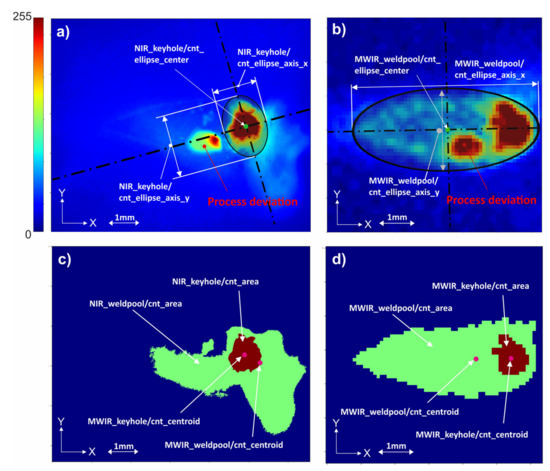 Taking into account two different image types (i.e., NIR and MWIR image data), 86 features are calculated for every th image and for each image type . Equation (11) shows the aggregated feature list which consists of several feature subgroups as stated in Table 2. Geometrical features based on the extracted keyhole and weld pool contours are defined as one feature subgroup.
