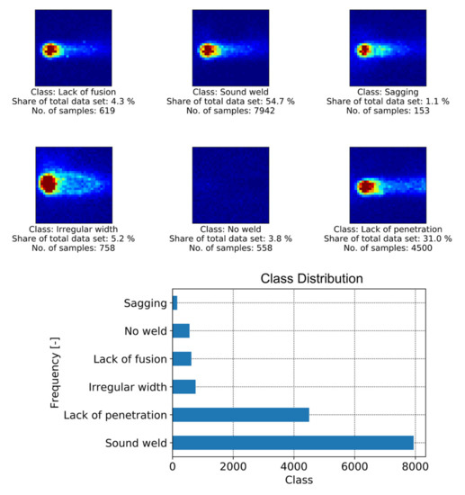 Example of MWIR image data and sample distribution of different quality states based on 13 weld trials (14,530 samples) that form the welding data set.