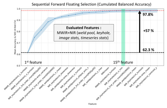 The feature that provides the highest balanced accuracy score is included as the most important feature in the new subset. Afterwards, at every step, classifiers are trained for each combination of the important feature and the remaining features to determine the most important feature. The floating version of SFS (SFFS) has an extra step that allows the removal of features that were previously included (or excluded), resulting in an increased search space to find the optimal feature subset. It has been shown that SFFS enables the selection of appropriate features with high efficiency, especially compared to methods such as “Min-Max search”, “branch and bound” or SBS, which is why it is used in this work [64]. Based on the SFFS algorithm, Figure 7 shows the cumulated accuracies for 20 out of 172 features based on weld pool and keyhole characteristics, as well as overall image and time series statistics extracted from MWIR and NIR welding images. Starting with the far-left feature, SVM models were trained and evaluated consecutively by adding a feature in a further step, until 20 features were added to the final feature subset.