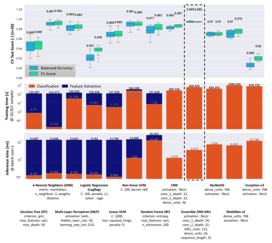 The ensemble deep learning architecture is also compared to state-of-the-art CNNs for image processing. For this purpose, common architectures such as ResNet50V2 and MobilNetV2 and InceptionV3 are used for comparison with respect to prediction performance and inference times. By replacing the original classification heads, the pre-trained models are trained with new fully connected classification heads consisting of a hidden layer (i.e., 768 nodes) and the output layer (i.e., 6 nodes). In this study, all other layers except the new dense layers were set to be untrainable.