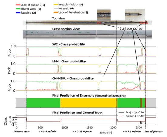 The ensemble deep learning framework is compared with established architectures such as ResNet50V2 [40], MobileNetV2 [41] and InceptionV3 [42] and a baseline CNN architecture without GRU layer and the ensemble strategy. In addition, a comparison of the proposed framework with conventional machine learning using manual feature extraction methods is given. For that, geometrical and statistical features are extracted from thermal image data (MWIR and NIR) to determine the keyhole and weld pool characteristics for each time step. The features are based on higher-order image moments, shape descriptors and descriptive image statistics as well as statistics in the time domain, that are used to establish a high-dimensional feature vector. In addition, we determine the significance of individual features and the relevance of different feature subsets in terms of their classification performance. Subsequently, all models are optimized using a grid search process combined with nested cross validation. In a further step, the deep learning architectures are compared with classical machine learning approaches based on the individual prediction performance in four unseen welding trials. Finally, the proposed ensemble deep learning model is optimized for real-time inference as well deployed and evaluated on an embedded computing board (NVIDIA Jetson AGX Xavier). A schematic overview of the data processing and evaluation steps applied in this work is given in Figure 1.