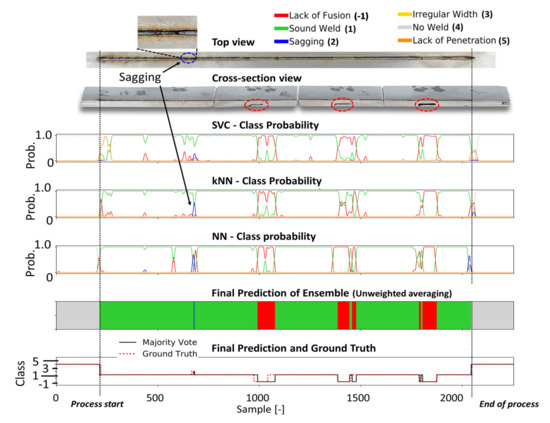 Process monitoring and fault detection are an essential requirement for a multitude of manufacturing processes and are particularly relevant and necessary when human safety is at stake (e.g., safety-critical automotive parts, battery parts, aerospace parts). In addition, however, for joining processes in the process industry or in power generation (e.g., nuclear power plants), early detection of defects and deviations can shorten processing time and enable online compensation of process deviations for “first time right” production. In particular, complex joining processes such as laser welding (LW) require suitable quality monitoring procedures in order to satisfy the constantly increasing demands for high-quality products in modern and flexible production environments. In laser deep-penetration welding, a laser beam is focused on the material’s surface. The energy provided by the laser radiation heats the welding material and as a result, the temperature at the focus of the laser beam exceeds the boiling point of the material. This leads to a vapor capillary (keyhole) which increases the penetration depth of the laser beam into the material due to the occurrence of multiple reflections within the keyhole. Although laser welding processes are well known, automated in-line quality diagnosis still remains a challenge [1]. In practice, weld quality is affected by several factors, such as thermal conditions during laser–material interaction, variations in material properties, impurities on the workpiece surface, and changes in the properties of the laser beam, all of which may result in an unacceptable product [2,3]. During laser welding the complex interaction between laser beam and the weld material can lead to weld imperfections such as cavities, solid inclusion, lack of fusion as well as lack of penetration, weld seam deformations, cracks, and other deviations from the desired weld quality. A reliable quality diagnosis tool must provide high sensitivity for critical defects but also a certain adaptability in case of required process changes.