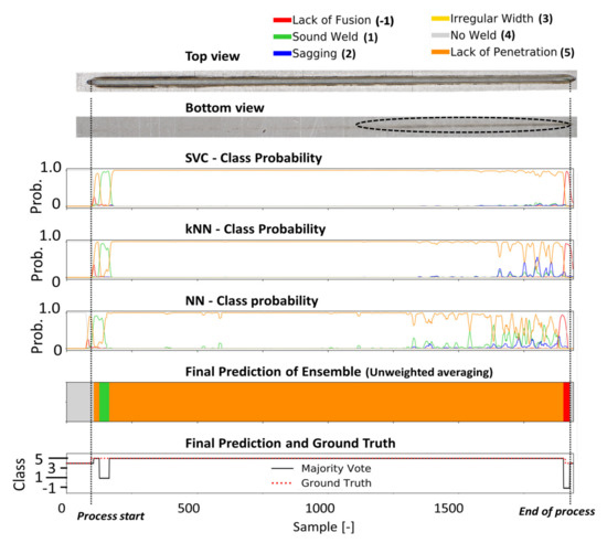 The next section presents the feature evaluation, the results of the comparison among the classification algorithms and the final performance evaluation based on complete and unseen weld trials. Various metrics can be used for assessing the performance of classification models. Accuracy, for example, has the advantage of being simple to interpret as it represents the ratio of correctly classified samples to the number of total samples. However, accuracy is not considered a robust measure when dealing with unbalanced classes, which is the case for the weld data set. Therefore, the F1-Score is introduced as main metric to measure multi-class classification performance on the unevenly distributed weld data set [46]. On the basis of the definition of true positive (TP), true negative (TN), false positive (FP) and false negative (FN) detections, accuracy and F1-Score are defined as follows [43]: