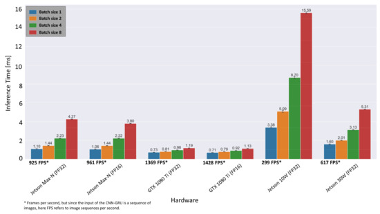 In this work, CNNs are utilized to automatically extract relevant characteristics from raw camera images. It is also possible to extract spatio-temporal information from video streams using 3D-CNNs, to extract patterns from temporal changes between adjacent frames. For example, 3D-CNNs are often used to recognize gestures or emotion in videos [35,36,49]. However, compared with approaches that combine CNN with RNN structures such as long short-term memory (LSTM) or gated recurrent units (GRU), 3D-CNN has a disadvantage that derives from its high computational complexity and excessive memory consumption, which can be a major burden for several applications that require high inference rates, especially on embedded devices [50]. Additionally, RNN architectures can be used to extract long-term temporal characteristics, whereas 3D-CNNs are mostly used for the extraction of short-term temporal pattern [51]. Therefore, the combination of CNN and LSTM has been used recently for action recognition in video data that is still a challenging problem in computer vision [34,52]. LSTMs have become especially popular due to high performances achieved in domains such as natural language processing, but recent findings suggest that GRU architectures offer very comparable accuracies compared to LSTM with lower computational costs. [39,53].