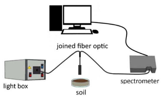 A deuterium halogen light box was used as the light source. The light reflectance from the sample was measured by placing 5 g of air-dried sieved sample into a quartz glass petri dish three mm-diameter, as shown in Figure 1. The set-up includes a fiber-coupled spectrometer FCR-7UV200-2-ME from Avantes that is fixed perpendicularly to have a 3 cm distance between the probe and the samples. The light from a light source is sent through six illumination fibers to the sample, and the reflection is measured by a seventh fiber in the center of the reflection probe tip. The AvaSpec-ULS2048CL-EVO-RS and AvaSpec-HSC-TEC perform the light measurement in the UV-VIS-NIR range of the electromagnetic spectrum. Spectra normalization was performed by dividing soil reflectance spectra by the white body reflectance spectra used here as a reference.