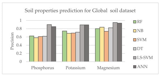 The obtained results reported in the previous section indicate ML methods’ advantages and disadvantages, allowing creating an optimal strategy for research. It was shown that the method’s high level of performance complexity does not always guarantee a satisfying level of performance accuracy. The LS-SVM and ANN showed the most promising results. Nevertheless, they do not show the best result for a Local soil dataset in this research. For example, the RF showed better performance for a potassium prediction and DT showed similarly as ANN result for magnesium prediction. Results corresponding Global soil dataset indicates that LS-SVM overperforms ANN for phosphorus and magnesium prediction. Moreover, the computation time for processing ANN was always the highest, taking up to a few minutes to compute on a standard personal computer. It is worth mentioning that every time the category is changed, the machine learning parameters have to be changed as well. For example, for our research dataset, ANN gave the best results when 10 layers were used for categories with 5 levels, while for categories with 13 levels, the best result was obtained with 20 layers.
