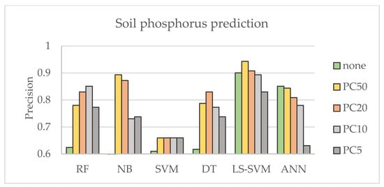 Using the machine learning settings defined in the previous experiment, the influence of principal components was investigated. The first 5, 10, 20 and 50 principal components with the highest score were selected for analysis compared with the result obtained without dimensionality reduction. The obtained results are presented in Figure 5 and show the improved accuracy of soil category prediction for all methods except ANN, where the result was improved only for magnesium. It can be noted that the variation in results is similar for each nutrient. The influence of PC can be observed to varying degrees for each method’s accuracy. It can be found that SVM performance varies less and therefore is more stable when the performance of NB, DT and RF strongly depends on the selected PC. In general, the results of ML techniques show good performance for PC20.