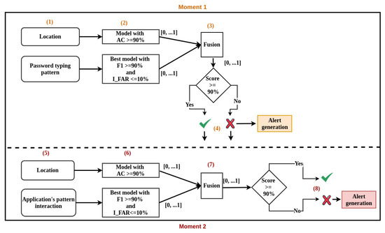 - Step 7: Fuse the AC, for the location pattern, with the F1 Score, for the pattern interaction with the application post-login activity, using the simple arithmetic mean;