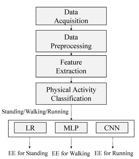 Figure 1 depicts the system architecture used in this study. The system was used to perform five tasks: data acquisition, data preprocessing, feature extraction, physical activity classification, and EE estimation. The performance of three models, namely linear regression (LR), multilayer perceptron (MLP), and convolutional neural network (CNN) models, for estimating the EE of each activity were compared. After physical activity classification, the independent models for activity prediction were used for training and EE estimation.