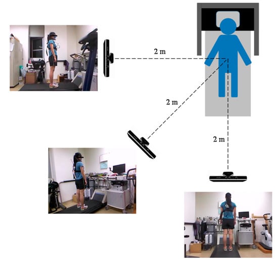 The dataset used in this study was obtained from a study conducted in 2019 []. Three XBOX 360 Kinect cameras (Microsoft Corp., Redmond, WA, USA) were placed along three directions, namely the side, rear side, and rear view directions. The positions of the Kinect cameras are illustrated in Figure 2. Each Kinect camera was installed and fixed to a tripod 0.9 m high. The distance between each camera and the participant was set to approximately 2 m, which ensured that the Kinect cameras could capture the participant’s entire body. The sampling frequency of Kinect is 30 Hz.