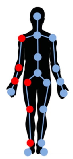 Map of the Kinect-tracked skeleton joints. The red-marked joints represent the selected joints.