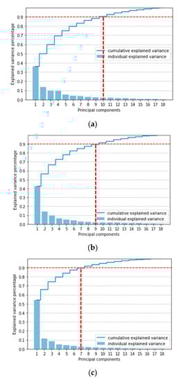 Principal component (PC) analysis (PCA) is used to reduce feature dimensionality. In this study, PCs that cumulatively accounted for more than 90% of the overall variances were retained []. The numbers of feature subsets from the side, rear side, and rear views were 10, 9, and 7, respectively. The cumulative explained variance of the retained PCs is plotted in Figure 4.