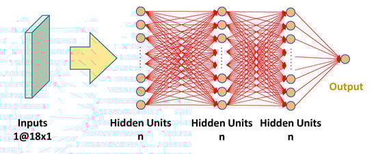 To obtain the optimal model for estimating the EE during physical activities, the estimation results obtained by using three models, namely LR, MLP, and CNN, were compared. The reason of testing the three models is that these are the most common models in statistical, machine learning, and deep learning fields. The LR model can be used to determine whether the ground truth and estimated output are highly correlated. The MLP model is a type of feedforward artificial neural network, which comprises an input layer, an output layer, and several hidden layers []. The MLP model used in this study contained five layers: one input layer, three hidden layers, and one output layer, as presented in Figure 5. Different numbers of nodes n were tested to obtain the optimal number of neurons in the hidden layers to achieve optimal regression results. The logistic function was used as the activation function to estimate EE for different numbers of neurons, and mean square error (MSE) was used to evaluate the performance of different numbers of nodes. The number of nodes varied from 10 to 90 in increments of 10 neurons.