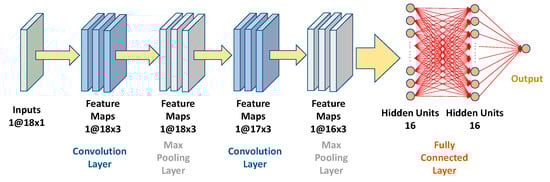 CNN is widely used to recognize objects and patterns in images []. In this study, CNN was used to automatically extract the features of kinematic data. The structure of the constructed CNN model is depicted in Figure 6. The CNN model used in this study comprised one input layer, two convolutional layers, two max-pooling layers, and one dense layer. The kernel size for each convolutional layer was 3 × 3. The rectified linear unit activation function was used in each convolutional layer []. Eighteen velocity data were input as the 181 input layer. The two convolutional layers were used to detect the features of the input data and create the feature maps automatically. The fully connected layers comprised two hidden layers with 16 hidden units per layer. In addition, the final output layer will output the result of the MET.