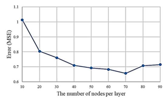 For the MLP model, different nodes were tested to obtain the optimal model for the further comparisons. Figure 7 indicated that the lowest MSE was achieved when 70 neurons per hidden layer were used. The MLP with three hidden layers which contains 70 neurons per layer was adopted for the further comparisons.
