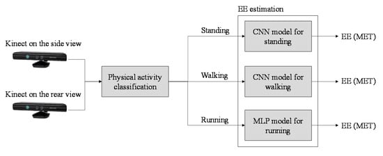 The proposed study can be regarded as an extension of the study of Lin et al. The motivation of the proposed study is to propose a Kinect-based EE estimation system to solve the problems and limitations associated with the previous research of Lin et al. This study investigated if applying the physical activity classification algorithm to the EE estimation system can improve the accuracy of EE estimation, which has not been confirmed in previous studies. Moreover, the proposed study investigated the best model for each type of physical activity for different camera settings. The study adopted a physical activity recognition algorithm to classify the postures captured by Kinect depth cameras into three activities, namely standing, walking, and running. Only 18 velocity-based features were used for EE estimation in this study to lower the computational complexity for feature extraction and selection. Three types of models were adopted to develop an independent model for each activity, and the model with the best performance for each activity was selected. The proposed system hypothesized that using the posture classification algorithm can improve the accuracy of EE estimation and is expected to obtain the optimal model for each physical activity for different camera settings.