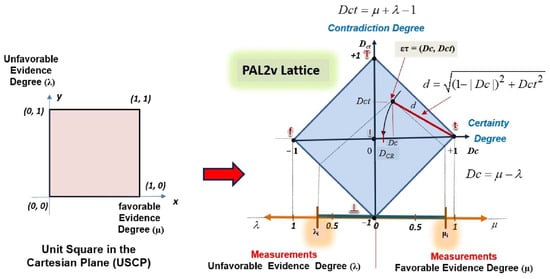 Unit square on Cartesian plane (USCP): lattice κ and PAL2v lattice with Dc (certainty degree (X)), Dct (contradiction degree (Y)), and distance d for obtaining DCR.