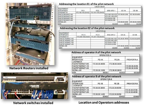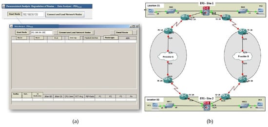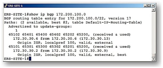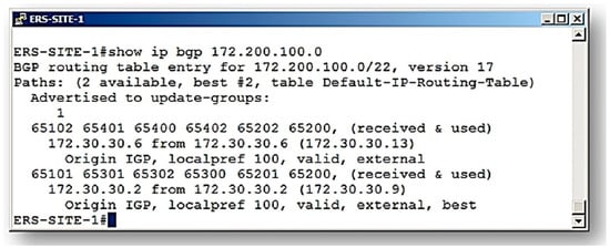 In this second analysis, we consider the result presented by BGP on the pilot network, as shown in Figure 11. It is observed that the communication route traced by the BGP routing algorithm indicates that the route (65101–65301–65302–65300–65201–65200) was defined as the one with the best characteristics (Signalizing–best ERS-SITE-1#). This route is called route B.