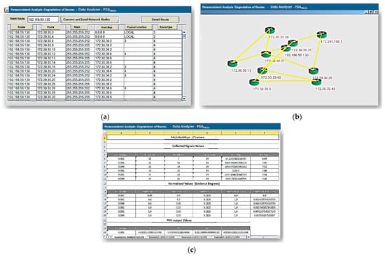 The component modules of the data analysis system shown in Figure 4 are (a) a component called Monitor, used to collect the information of the network interconnection equipment; (b) a Register module, where metrics and other information of the communication links are stored to serve as inputs to the next component as sources of information; (c) a Paraconsistent Data Analyzer (PDAPAL2v) module with the function of analyzing the input information and providing as output the information that defines whether to change the route of the traffic to another link with better quality among those available in the memory cache of routes; (d) a Change Evaluator module, which, based on the information received from the Paraconsistent Analysis block, chooses whether there is another available route within the evaluated routes and, in the case of non-evidence of degradation, sends the information to the management module; (e) a Management module, whose function is to send the information to change the route to the interconnection equipment; and (f) an Interface module, whose function is to provide information about the process and allow human–machine interaction through a computer screen.