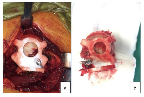 Figure 2. (a) Patient-specific femoral guide fitted to the proximal femur. (b) Femoral guide fitted to the proximal femur after the osteotomy cut.