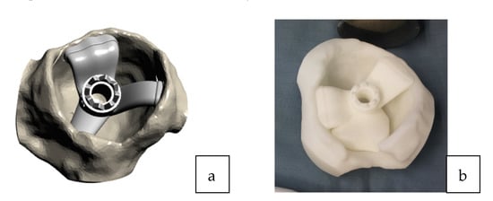Figure 3. (a) 3D acetabular model with the patient-specific guide in place. (b) The 3D printed form of the patient’s acetabulum is used as a model by the surgeon to guide them in the positioning of the laser guide.