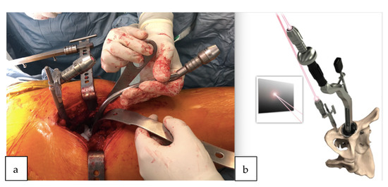 All surgeries were performed using a direct lateral surgical approach in a lateral decubitus position. The femoral exposure was performed as a standard practice. The femoral PSI guide was fitted on the femur and it was used to perform the planned osteotomy cut (Figure 2a,b). The acetabulum was then exposed and the soft tissue was removed as needed to fit the acetabular PSI guide (Figure 3a,b). A laser was attached to the guide using a curved handle (Figure 4). A reference pin topped with an articulated laser pointer was placed on the superior edge of the acetabulum. The light of the second laser was made to converge on the light of the first laser at the theater wall. (Figure 5a,b). The acetabular PSI and the corresponding laser were removed. A new laser was adapted to the top of the acetabular reamer. The reaming was guided by assuring the coincidence of the projected lights (reference laser and acetabular reamer laser) in all phases of the procedure. Afterwards, a laser was also adapted to the top of the impaction handle and the coincidence of the lights was checked again to guide the cup impaction (Figure 5b). After positioning the cup, the reference pin was removed.