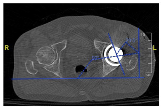 Figure 6. Measurement of the acetabular cup anteversion angle on a postoperative CT scan.