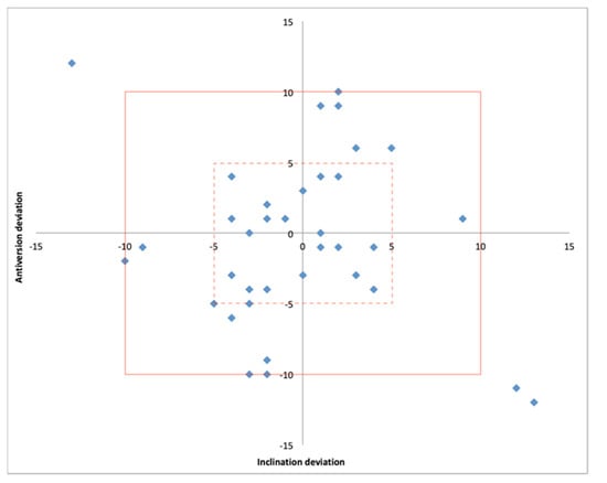 Figure 7. Scatter plot showing the position of the acetabular component within 5° (hashed line box) and 10° (solid line box) of deviation from the planned inclination and anteversion.