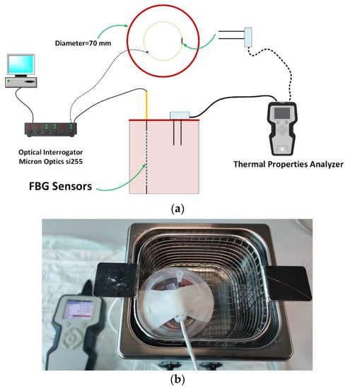 (a) Schematic view of the experimental setup; (b) picture of the container filled with liver, immersed in the temperature-controlled water bath, and including TEMPOS’s probe and needle housing FBG sensors.