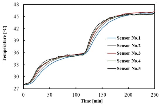 The temperatures measured by the FBGs across the tissue depths as a function of time are shown in Figure 2. For the sake of clarity, a subset of sensor responses is shown, i.e., 5 out of 10. The result indicates that after 1.5 h, the temperatures reached a constant value, which is a good criterion for the equilibrium condition.