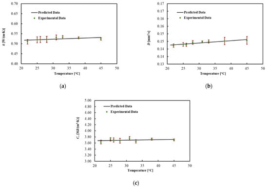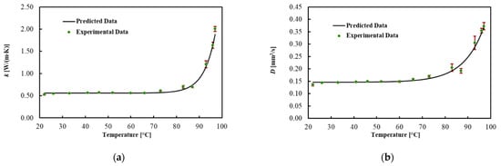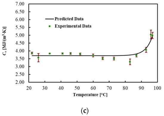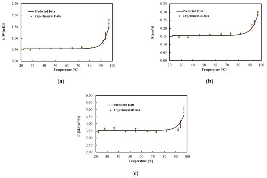 To describe the temperature dependency of the thermal properties, the best curves were mathematically fitted using Equation (6). The regression coefficients, the MPE and the R2 for each thermal property are reported in Table 2. The model fitted the data with R2 = 0.990 for k, with R2 = 0.978 for D and with R2 = 0.875 for Cv. In addition, the MPE between the best curve and the mean values of the measured data was 5% for k, 4.1% for D and 3.2% for Cv.